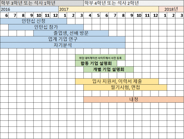 스케줄은 기업에 따라 다르지만, 대부분의 기업은 아래의 일정으로 전형을 진행합니다.